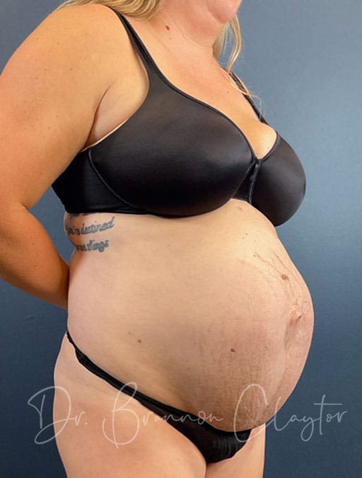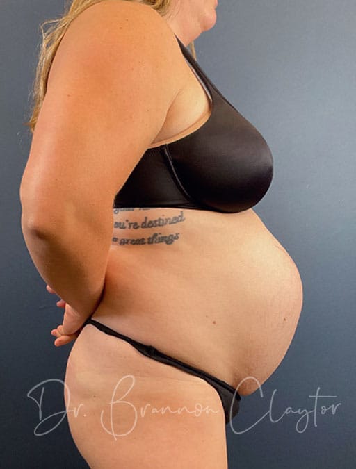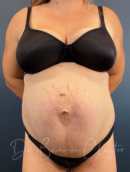 To address her concerns, Dr. Claytor performed a drainless abdominoplasty with repair of a 10-inch rectus diastasis and an umbilical hernia, along with flank liposuction to enhance contour. A bilateral breast mastopexy (breast lift) was also performed to restore shape and balance.