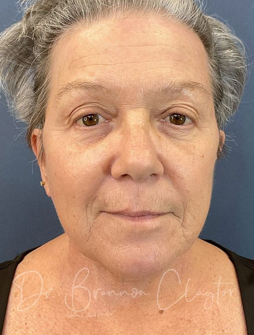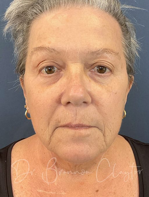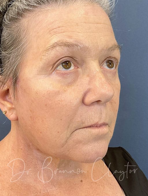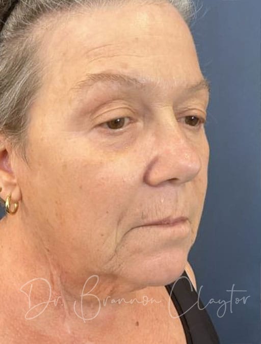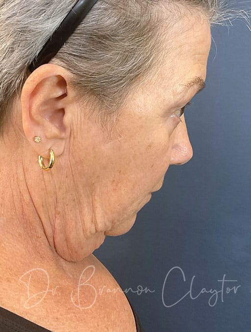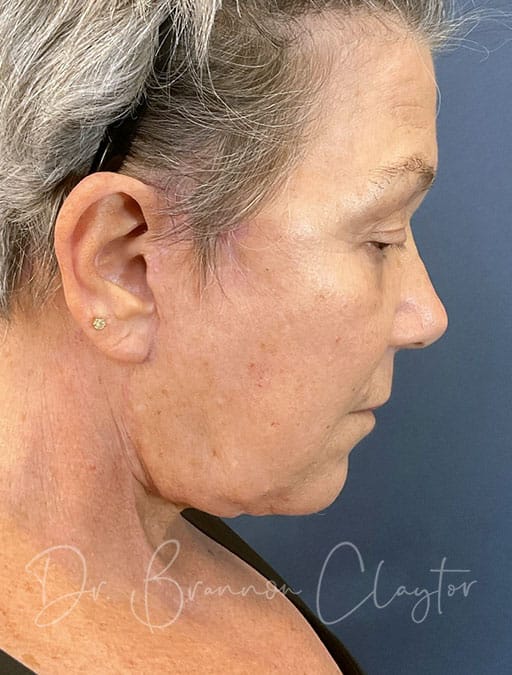 This 69-year-old female patient is shown 5 months post-op following neck lift performed by Dr. Claytor. The patient requested improvement with neck laxity she described as “chicken neck.” Dr. Claytor’s technique addressed loose skin and muscle banding to create a smoother, more defined neck contour with natural, age-appropriate results.